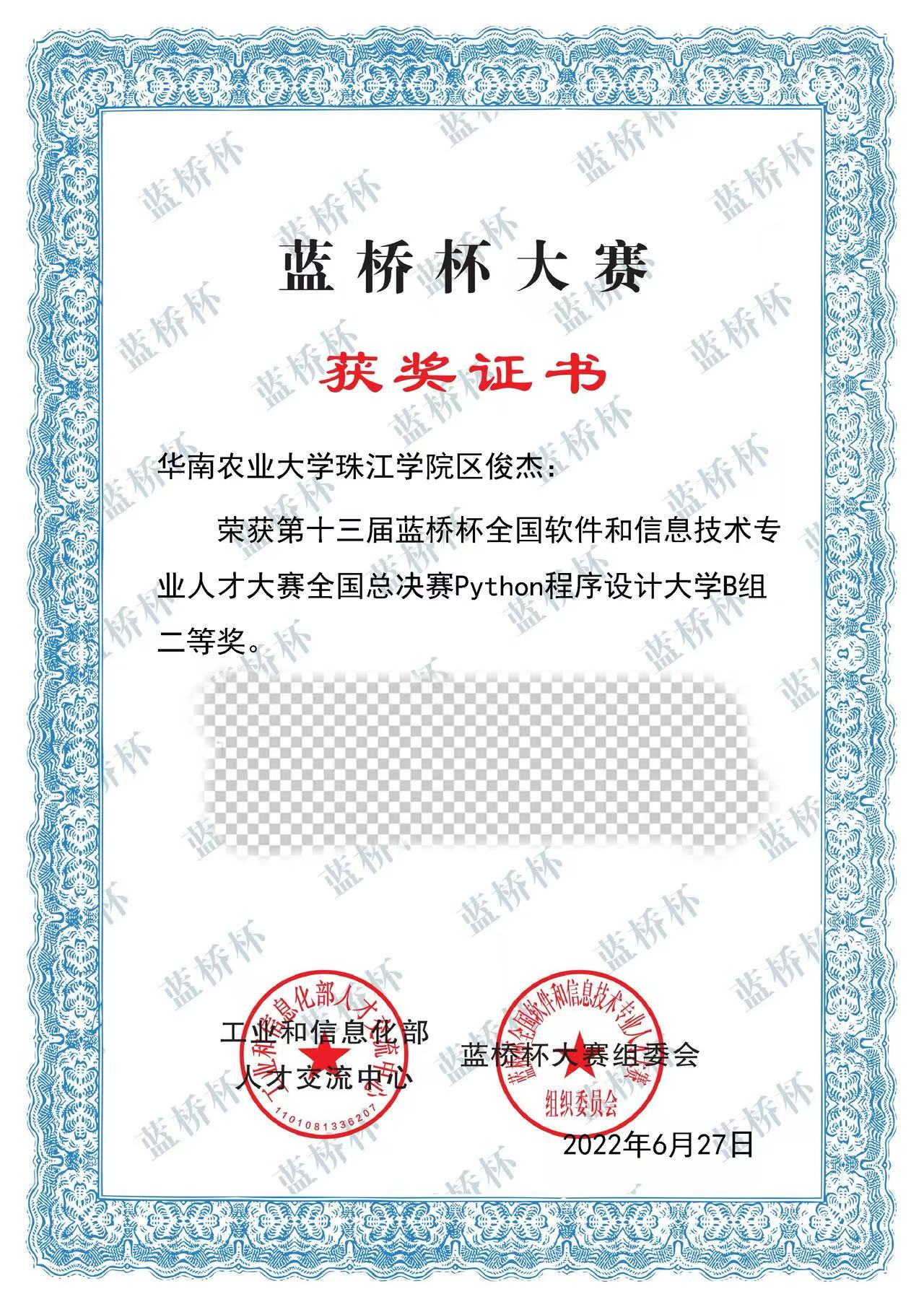 区俊杰同学以广东省赛区一等奖的优异成绩晋级全国总决赛。6月18日第十三届蓝桥杯全国软件和信息技术专业人才大赛个人赛(软件类)决赛在华南农业大学珠江学院顺利开赛,经过4小时的奋战,区俊杰同学力战群雄,取得了全国总决赛二等奖的好成绩。