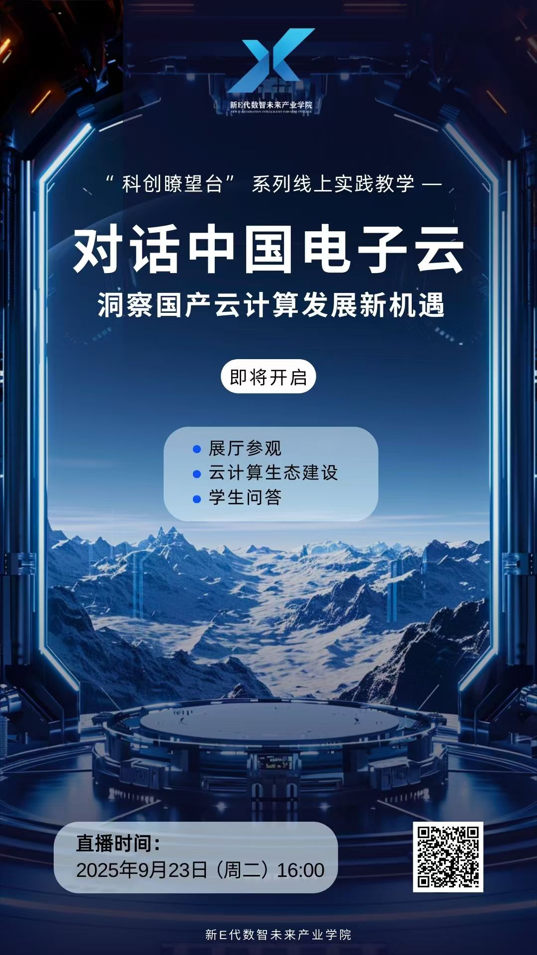 此次 “对话中国电子云” 线上实践教学活动,是新 E 代数智未来产业学院在产教融合领域的又一次成功实践。学院将持续依托 “科创瞭望台” 系列活动,搭建更多校企交流合作平台,推动教学内容与产业技术同频共振,助力培养更多能够担当民族复兴大任、适应数字经济发展需求的新时代创新型工程科技人才,为筑牢国家数字基座、推动国产云计算产业高质量发展贡献力量。